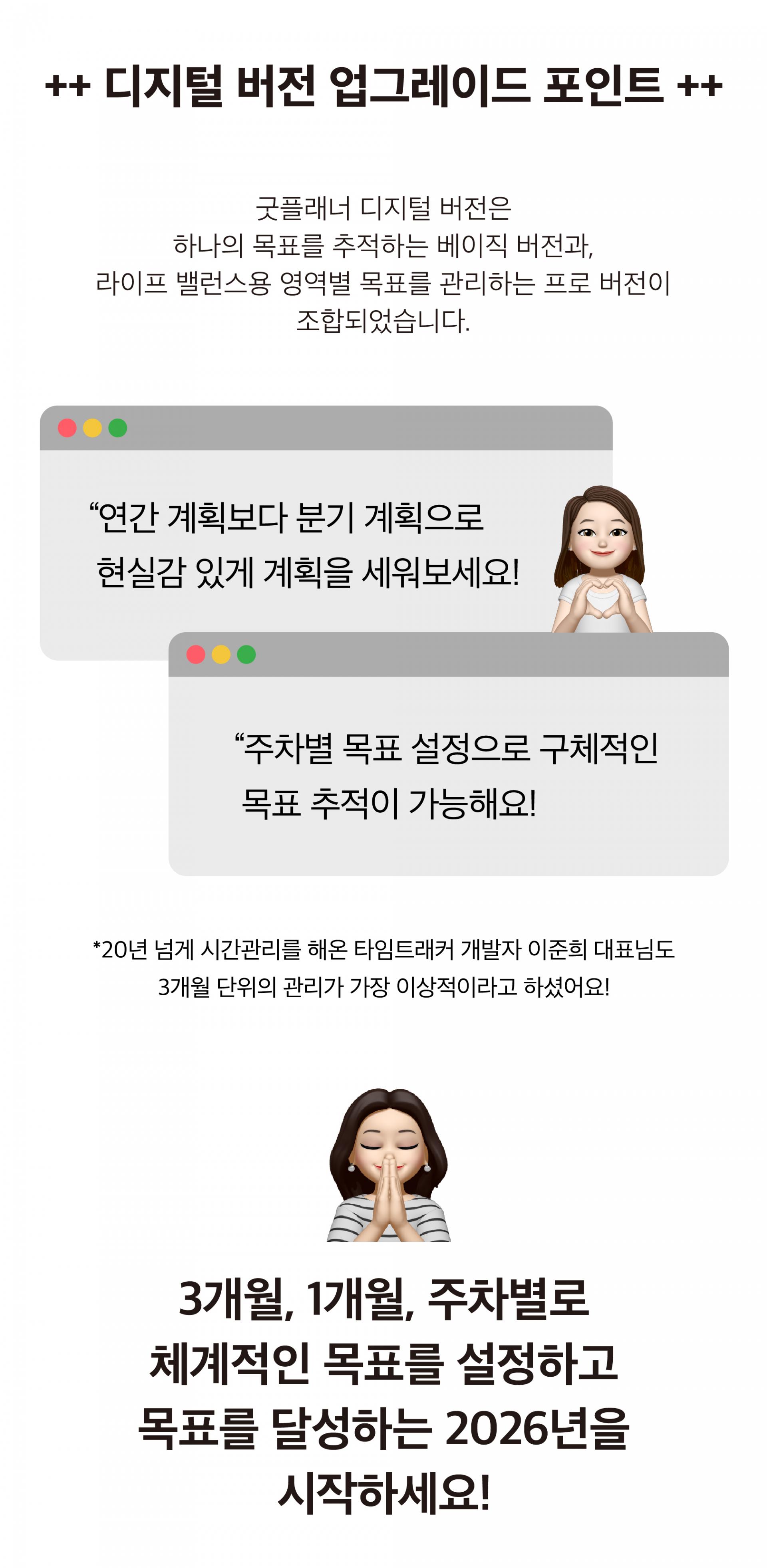 타임트래커 양식은 20년이 넘는 시간동안 발전하고 개발되었습니다. 타임트래커 프로토타입 출시 이후 지금까지 약 2만 명이 넘는 고객분들을 시간관리 커뮤니티로 만나 함께 플래너를 작성하고 실천하고 인증하며 플래너 사용 패턴을 분석했습니다.